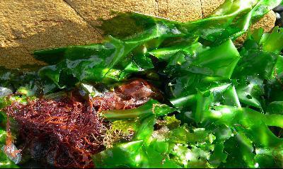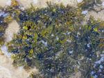 Fucus vesiculosus varies in color from olive green to olive brown to reddish brown to almost black and is typically about 40 centimeters in length (although fronds can grow longer). It attaches to rocky substrates by means of a small disc-shaped holdfast.? Fucus vesiculosus is characterized by the small nearly spherical gas¨Cfilled vesicles (bladders) which look like bubblewrap and occur in pairs one on either side of an obvious central midrib running along the center of the strap-like frond. The flattened, branching fronds can grow from one to two meters in length, and the air-filled bladders which keep the seaweed floating upright in its rocky anchorages increase its ability to photosynthesize. Typically it grows gregariously, forming dense mats of long ribbons up to one meter long and five centimeters across. The appearance of Fucus vesiculosus varies depending on the environmental conditions in which it occurs; in more sheltered areas there are many air bladders, whereas there are fewer in more exposed conditions. Also, in small plants, air bladders may be entirely absent.? In exposed areas, it is beneficial for Fucus vesiculosus to lack bladders, as this decreases the potential for severe damage, and minimizes the risk of it being detached and swept away.
